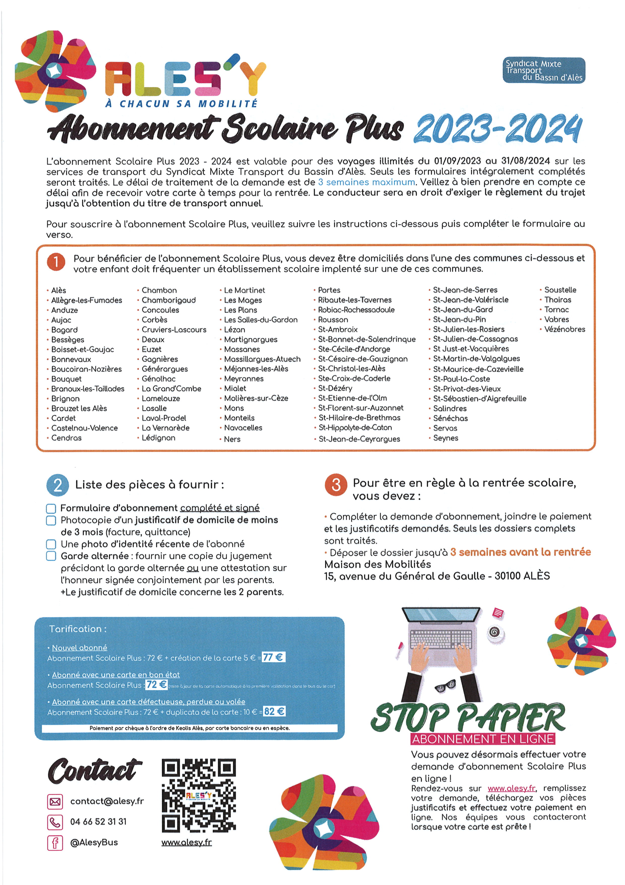 A télécharger le nouveau formulaire d'inscription pour le transport scolaire 2025/2026, pour plus de renseignements vous pouvez aller sur le site https://www.alesy.fr/ ou téléphoner au 04.66.52.31.31 (Maison des Mobilités Ales'Y).